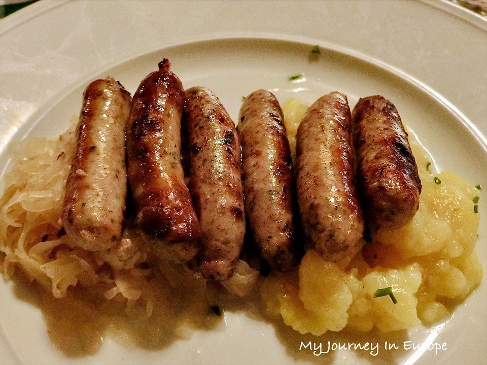 德國香腸種類繁多,這個香腸就是紐倫堡小香腸,比普通的德國香腸小一點也細一點,是紐倫堡的特色食物之一,底下搭配的也是酸菜跟馬鈴薯。