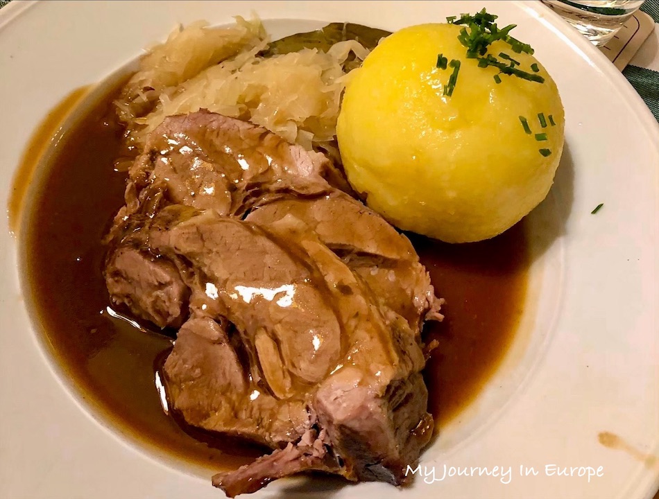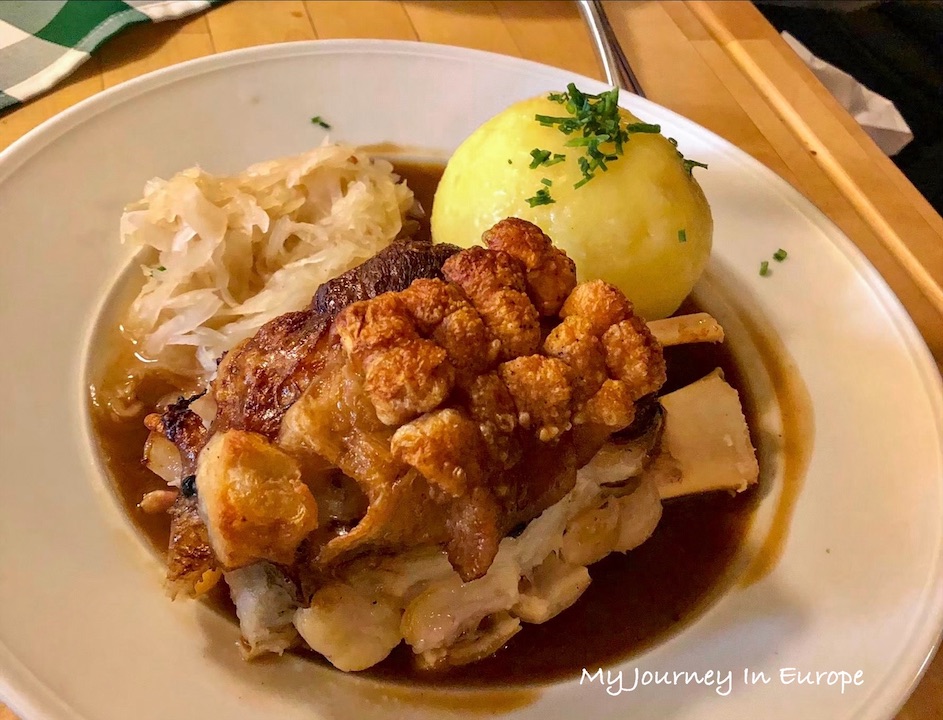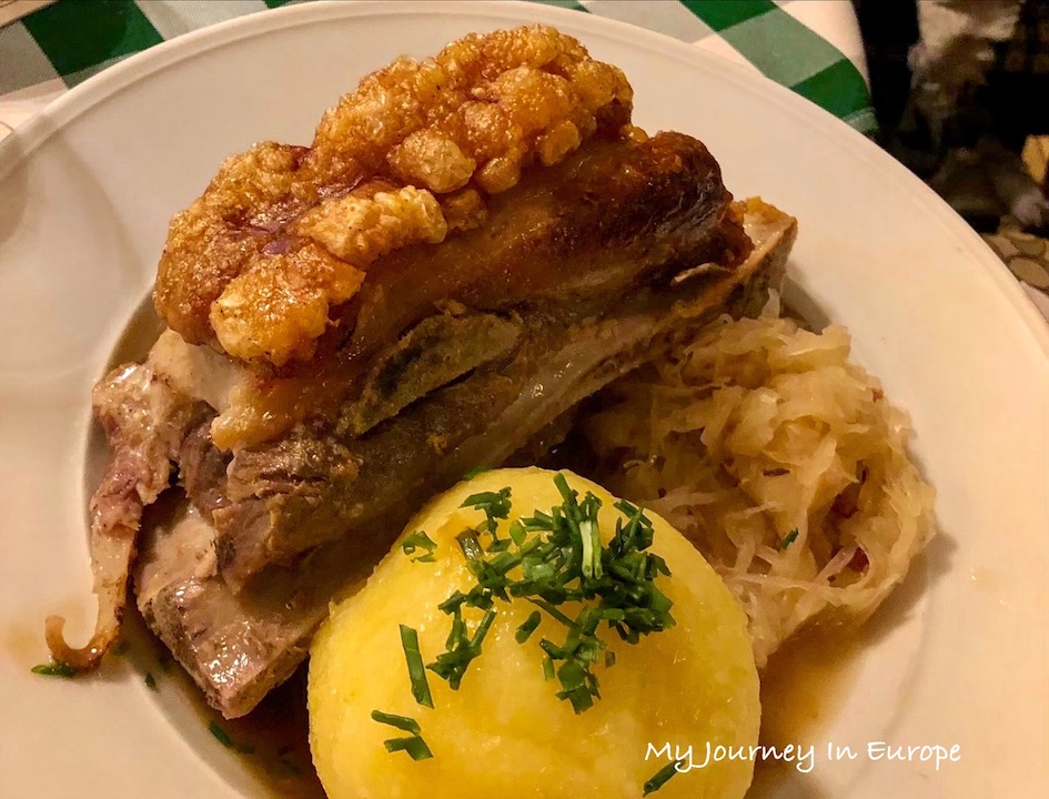 重頭戲當然就是這個烤豬肩(Rösches Krustenschäufele),這道菜一上桌就立刻吸引了大家的目光,豬肩很大一塊,皮烤的非常脆, 肉也很鮮嫩多汁,完全不會硬,刀子輕輕切下去就切下來了,不需要花很大的力氣去切,盤子裡也有醬汁,吃肉的時候可以沾一下。