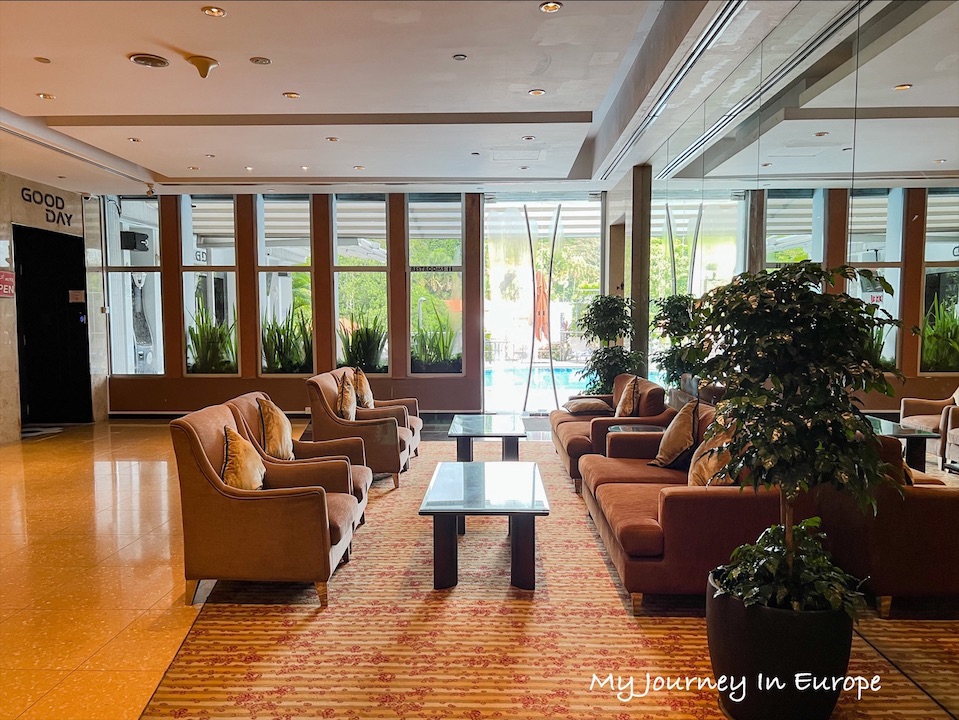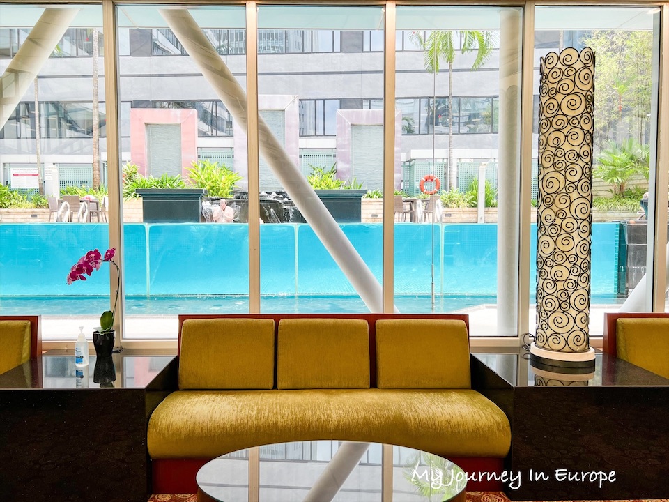 從大廳就可以看到外面美麗的泳池,大廳黃色的椅子搭配桌上的蘭花和外面藍色的泳池,顏色豐富也和諧,畫面很美,但在那邊游泳會被在大廳的人看得很清楚,不知道在那游泳的人會不會很尷尬。