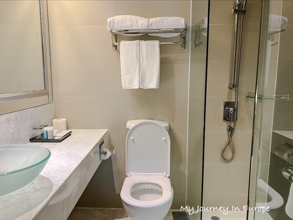 浴室雖然小,但很乾淨,我住的這間沒有浴缸,洗澡是淋浴式的。