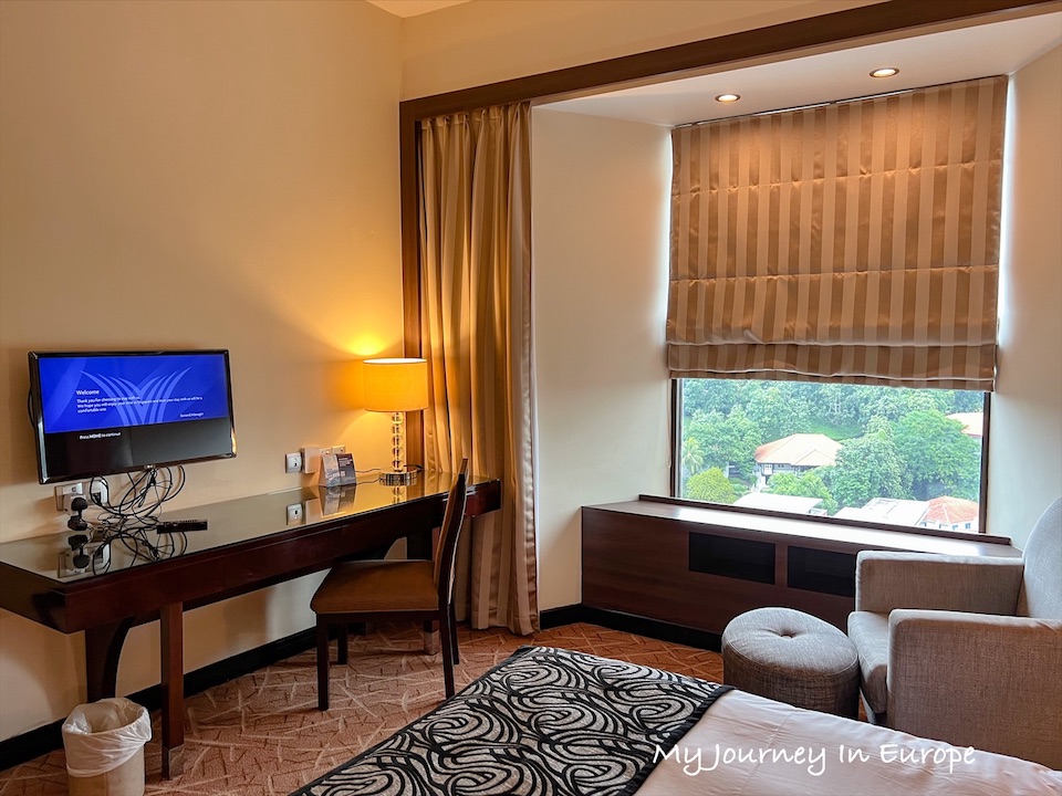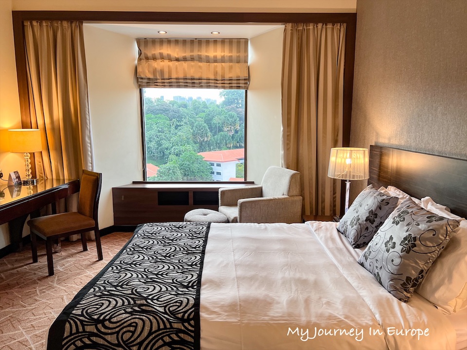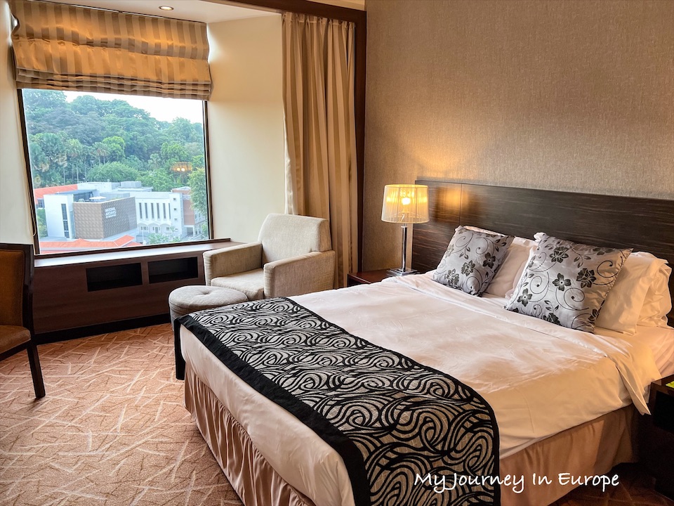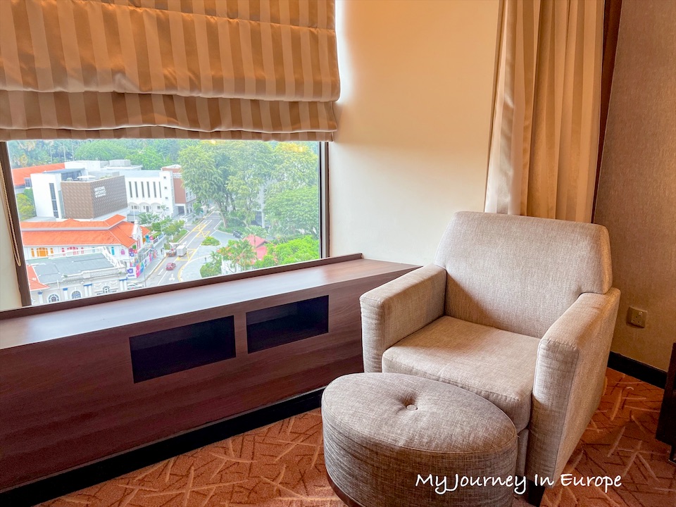 窗戶很大,可以清楚看到窗外新加坡的市景,窗戶旁還有一張沙發椅,我很喜歡在早上起床時,先坐在這個沙發上休息,看看窗外風景醒神一下。