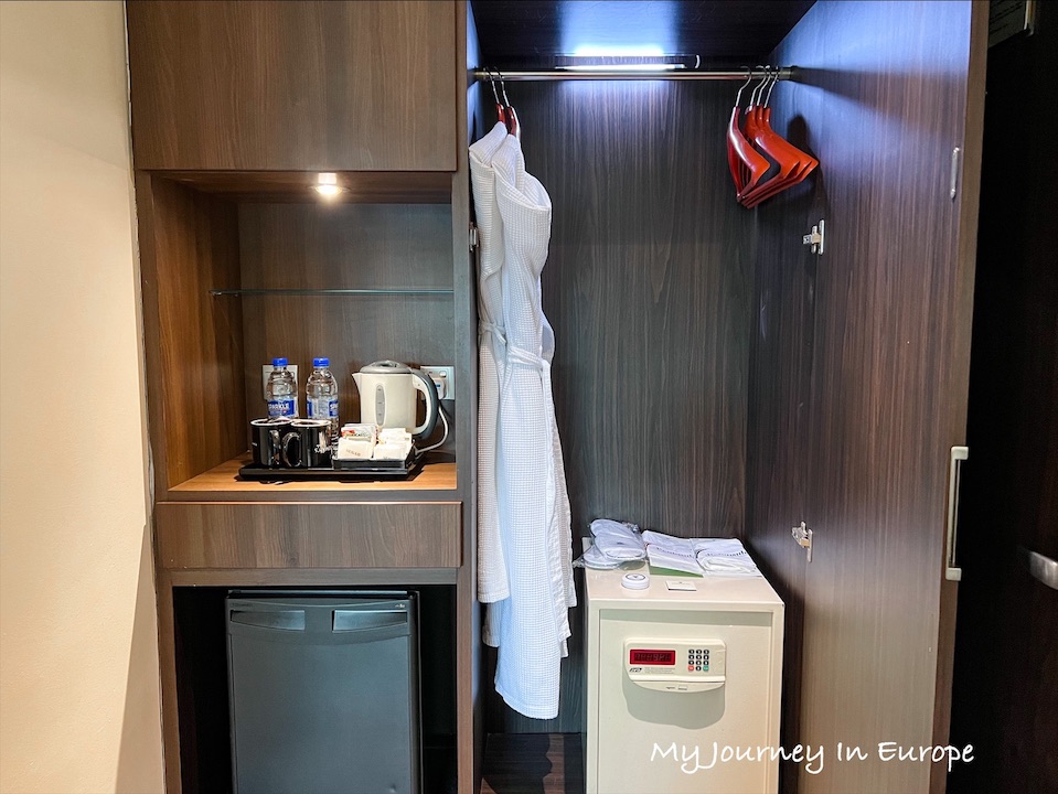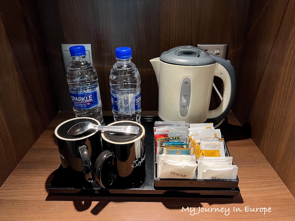 房間裡也有提供睡袍、室內拖、免費瓶裝水、茶包、咖啡等等,算是應有盡有。