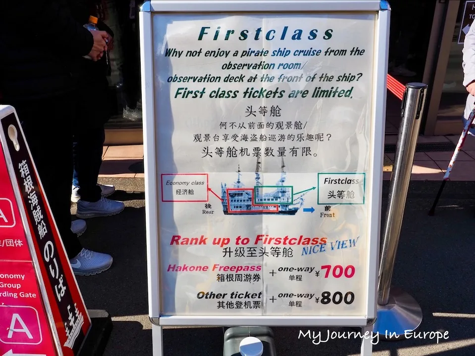 箱根海盜船票價:成人1,500 日圓、兒童500 日圓,來回票:成人2,500 日圓、兒童800 日圓,但如果你有箱根周遊券的話就可以免費搭乘。