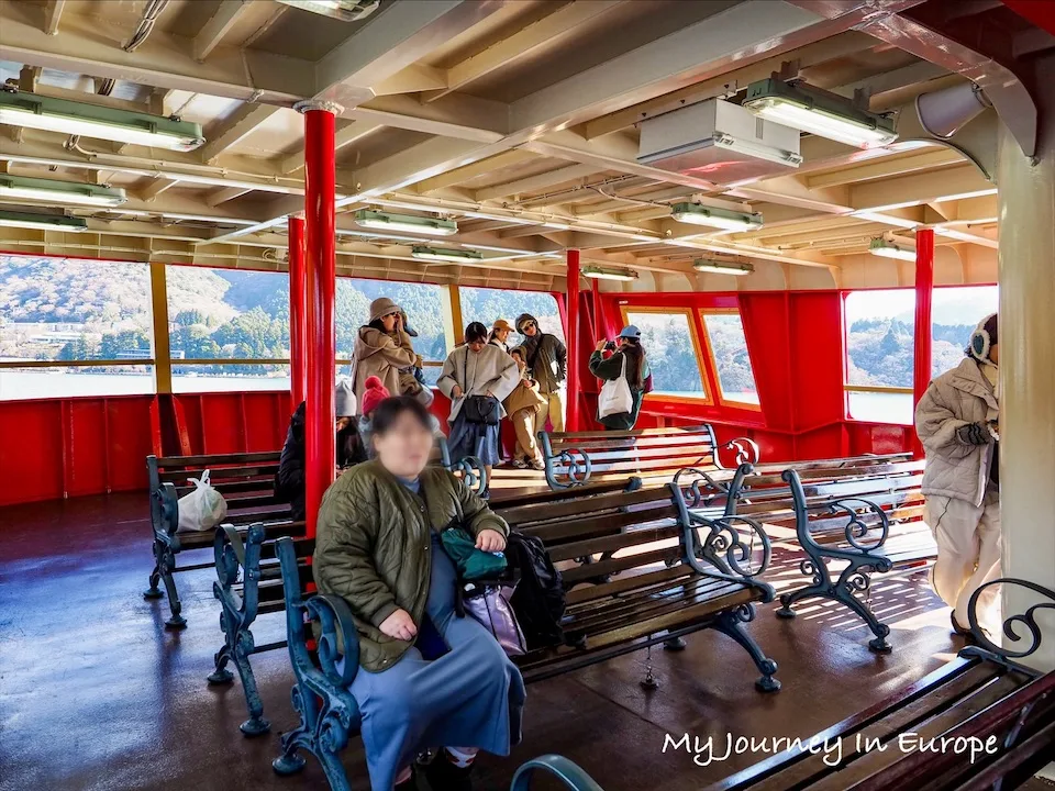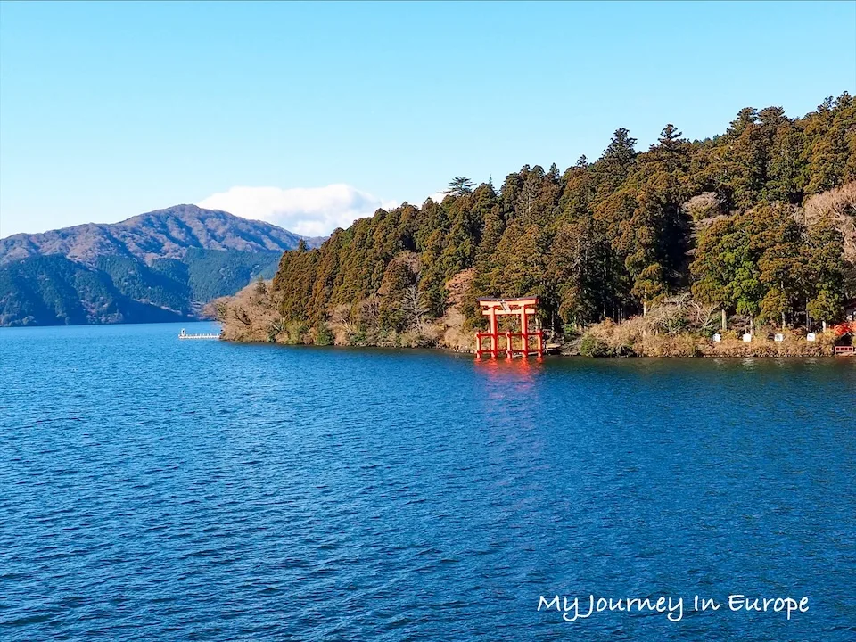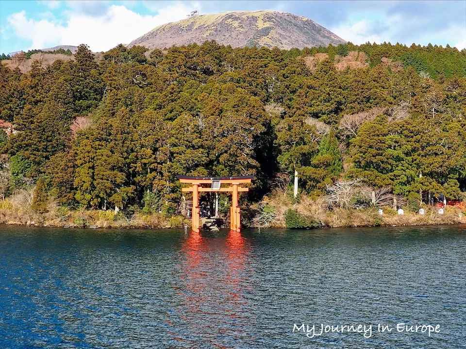 搭船的過程中,除了沿途風景之外,還有兩個東西必看!其中一個就是箱根有名的水上鳥居,紅色的鳥居在這一片山景湖景中特別顯眼。