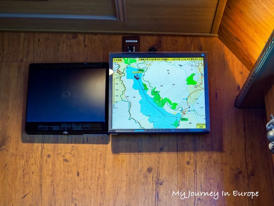 牆上有個螢幕可以看到船的行駛路線和目前位置,這樣大家就可以知道即將經過哪些地方,以及大約還有多久會到達下一個目的地。