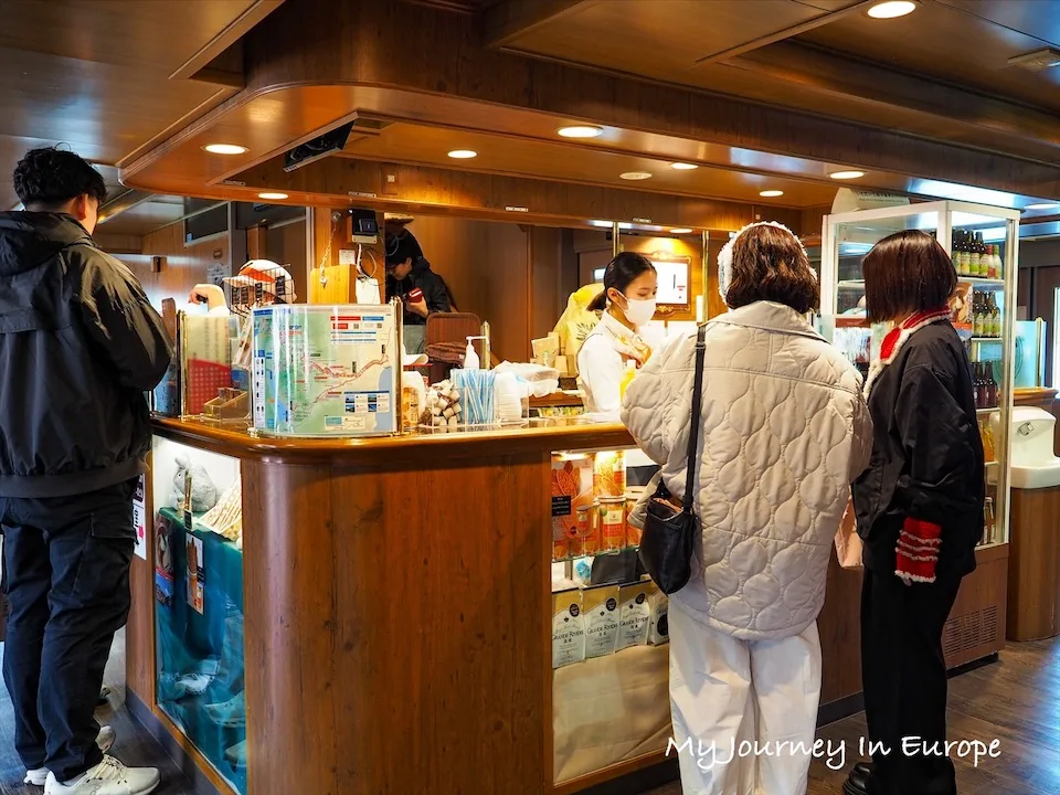 船上有飲食販賣區,如果想吃點或喝點東西的話,也可以在船上買。