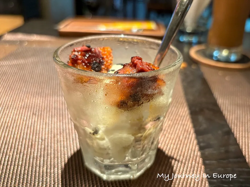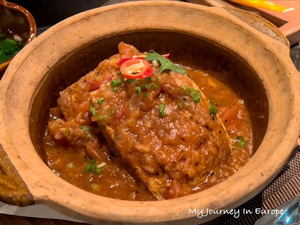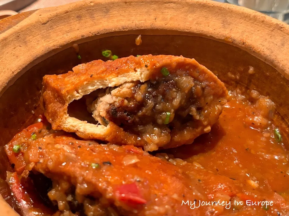 他們的豆腐有炸過,吃起來其實比較像是在吃豆皮,中間部分則是挖空塞肉,外面淋了用蕃茄調製的醬,吃起來味道不會太重,整體來說算是滿清爽的一道菜。